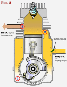В этот момент свеча поджигает сжатое топливо, взрыв которого толкает поршень вниз. При закрытии поршнем впускного коллектора, в кривошипной камере образуется разряжение, под его воздействием открывается клапан, и в камеру сгорания поступает новая порция топлива.