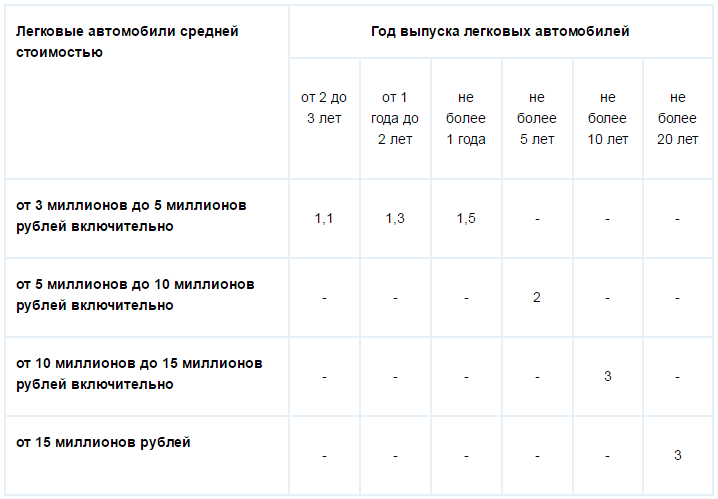Повышающий коэффициент – применяется для автомобилей стоимостью от трех миллионов рублей, также на значение этого коэффициента влияет год выпуска автомобиля. Этот коэффициент может находиться в пределах от 1(если авто стоит меньше 3 млн.) до 3 (если авто стоит свыше 15 млн рублей). Значения этого коэффициента вы можете посмотреть в таблице ниже.