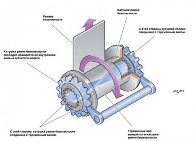 В каждом современном автомобиле ремни безопасности работают по достаточно простому принципу – катушка с блокиратором на основе зубчатого механизма, с помощью которого осуществляется вращение катушки. Сам зубчатый механизм закрывается небольшим маятником с шариковой или сфероидной опорой с системой рычагов. Когда ремень вытягивается плавно, опора вращается вместе с шестерней катушки, а при резком рывке маховик блокируется. В этой системе блокировке чаще всего и кроется неисправность.