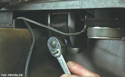 5) Затем отверните ключом один единственный болт, который удерживает кронштейн ремня безопасности на кузове автомобиля, и после чего извлеките болт из кронштейна.