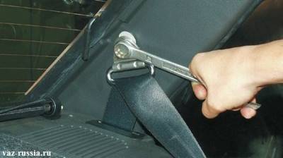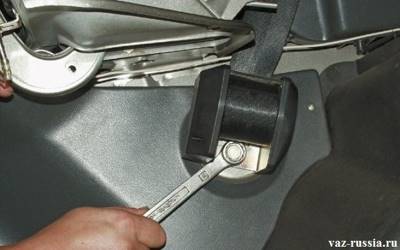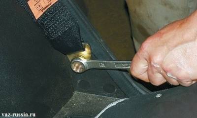3) Далее когда заглушка будет снята с головки основного болта, возьмите в руки гаечный ключ, и им отверните этот самый болт крепления нижней части ремня, и после чего извлеките болт из кронштейна.