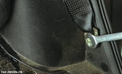Сначала нужно отверткой поддеть и снять декоративные накладки нижнего и верхнего креплений ремня безопасности.
