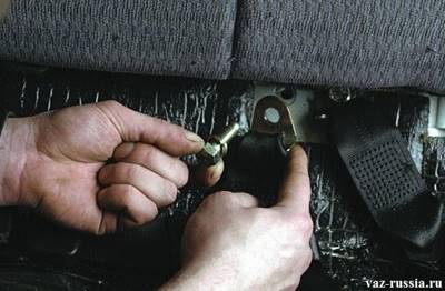 9) Следом если вам потребуется снять замок ремня безопасности, то для этого отверните болт, который удерживает замок ремня безопасности на кузове автомобиля, и затем снимите его.