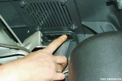 4) Теперь плавно переместитесь в салон автомобиля, и находясь в нем, возьмите рукой облицовку ремня безопасности, и установите ее на свое место.