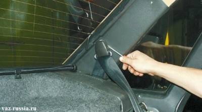 6) Теперь переберитесь в багажник, и рукой вытолкните на верх пластмассовую облицовку, через которую проходит часть ремня безопасности.