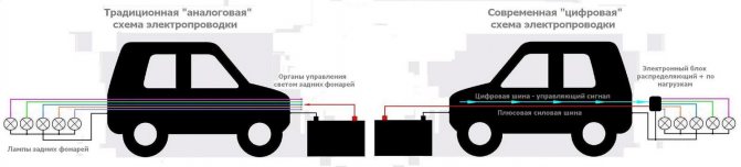 На простейшем примере это выглядит так. В традиционной электросхеме к многочисленным лампочкам задних фонарей идет через весь кузов как минимум 5 плюсовых проводов — стоп-сигнал, два поворотника, габариты и задний ход (минусовым, разумеется, является кузовная «масса»). В цифровой же конфигурации плюсовой провод – всего один, и еще один тонкий – цифровая шина. По ней блок управления, расположенный непосредственно возле задних фонарей, получает команды и раздает «плюс» тем лампам, которым он в данный момент требуется.