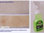 После протирания поверхности в течение трех минут и ее высыхания средство отлично удалило легкие загрязнения. Чтобы избавиться от проникающих пятен потребовалась вторичная обработка. Тем не менее от резкого запаха удалось избавиться сразу.