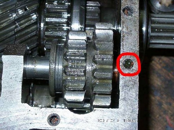 Снимаем вал шестерни задней передачи. Для этого плоской отверткой вывинчиваем из отверстия (отмечено красным на рисунке) стопорный винт, а затем выбиваем вал по направлению «из» коробки. Внутри шестерни — многорядный подшипник с пластиковой обоймой, вынимаем стопорные кольца, металлическую трубку и дефектуем подшипник. У коробки 72 года издания он оказался целым.
